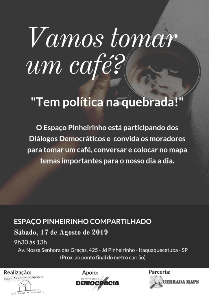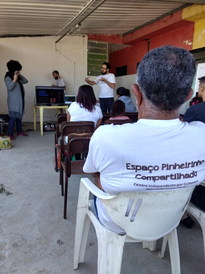 Em outubro de 2019 construímos junto com o Espaço Pinheirinho Compartilhado com apoio do Pacto pela Democracia um encontro para falar sobre política e periferia. O evento contou com uma uma séria de ações para o pensar e fazer político. O dia começou com um palestra sobre emergência política promovida pela Jéssica Cerqueira e rumou para um momento mais prático.