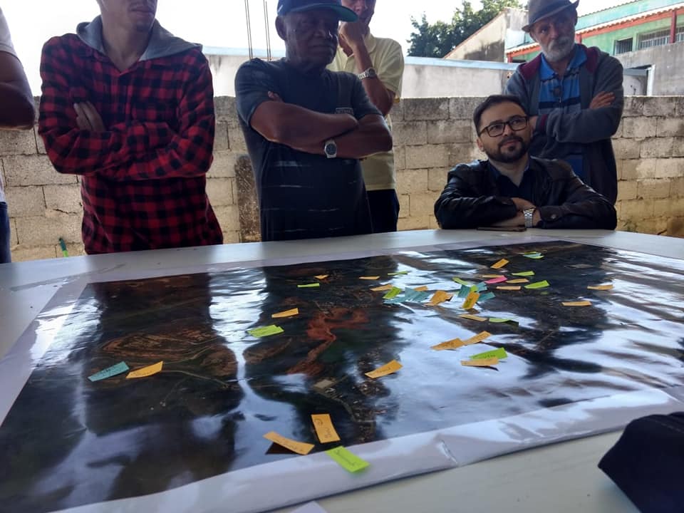 Enquanto isso, os adultos presentes construíram um mapa participativo sobre o acúmulo de experiências políticas no bairro. O Wellington Fernandes mediou a conversa e esta tentou recordar a presença de política público no território, mas também as ações promovidas pela própria comunidade para enfrentamento das demandas políticas do bairro. Resultado está disponível no mapa digital a seguir